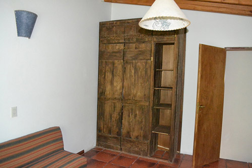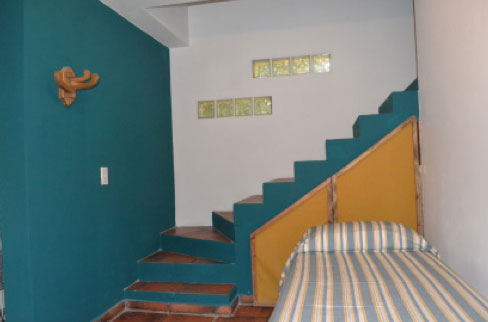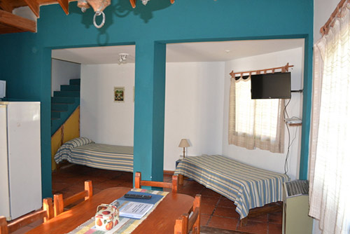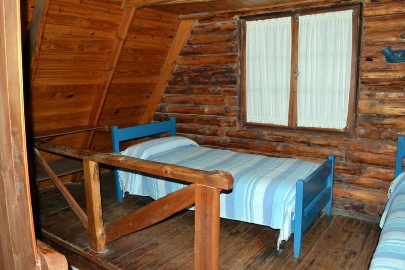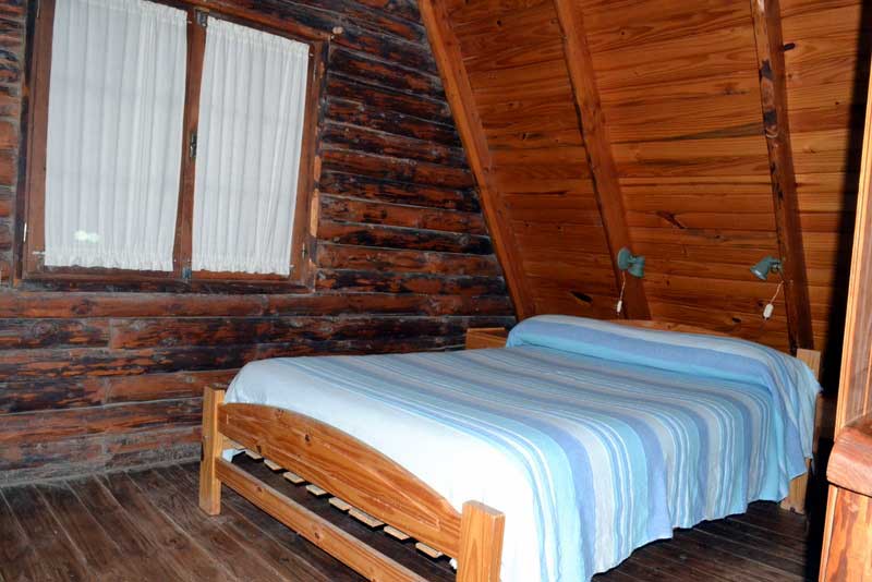 Las cabañas se disponen en dos plantas: en la planta alta hay una cama matrimonial y dos camas singles, separadas por un tabique.