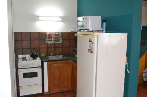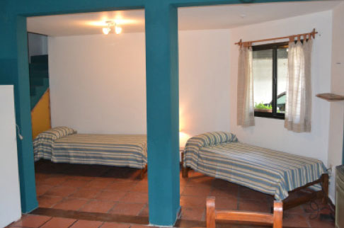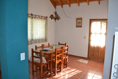 En la planta baja hay dos camas singles, mesa rectangular con 6 sillas, baño completo con bañadera y zona de cocina